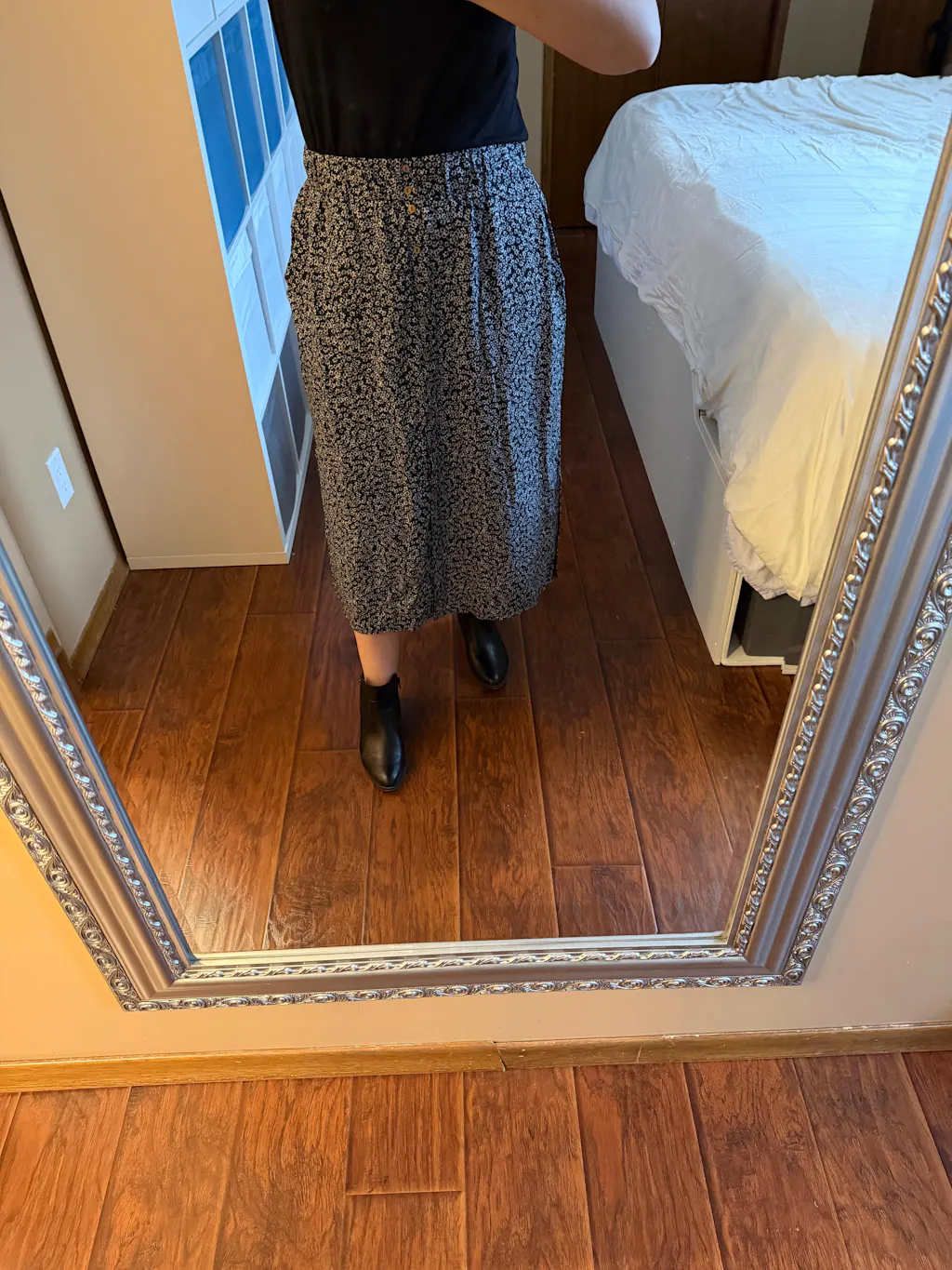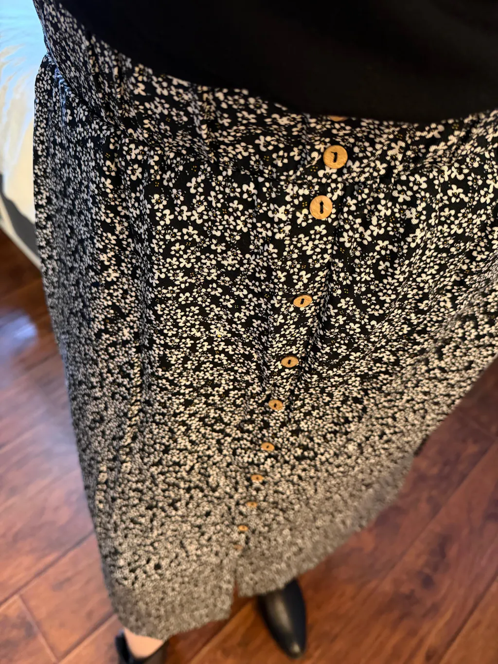 This skirt is soft and the waist band is comfortable and doesn’t dig in or leave marks on the skin. Deep pockets! The front and two side slits make the skirt “flirty” while still providing good coverage. I am obsessed with the coconut buttons. I see myself wearing this skirt with boots and a blazer for winter and in summer paired with a tank or tee and sandals. It also rolls up quite small making it the perfect choice to pack for travel.