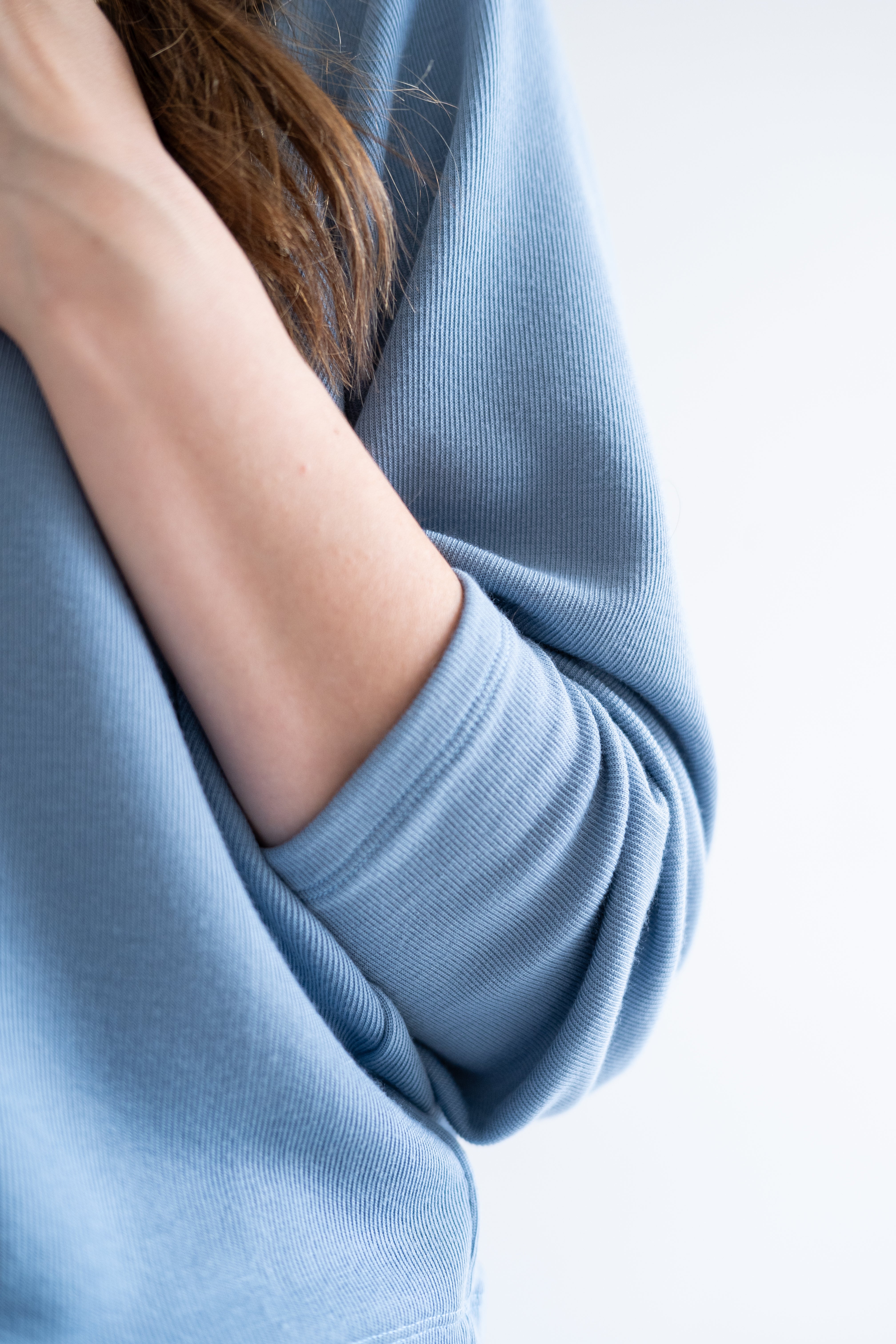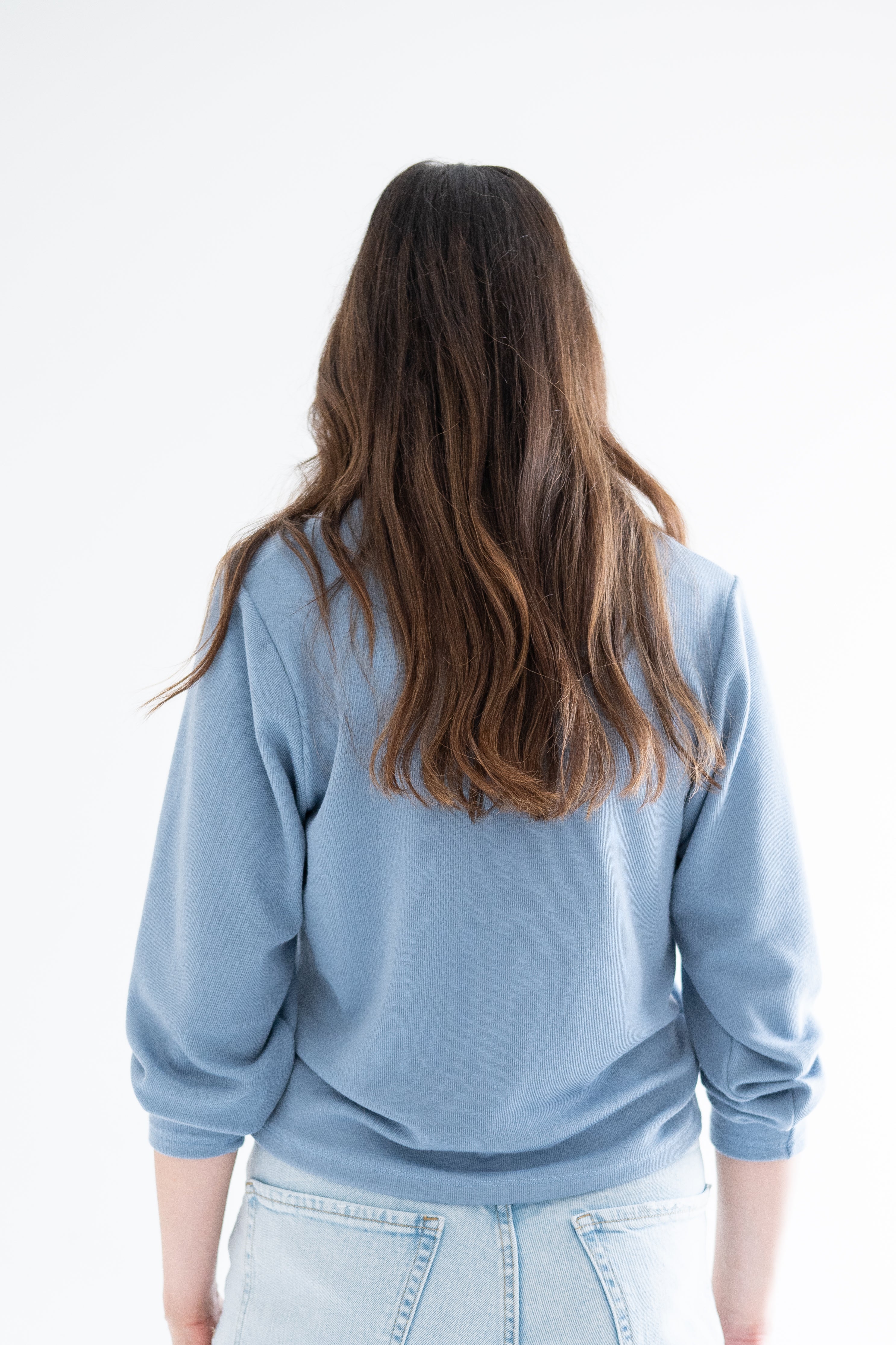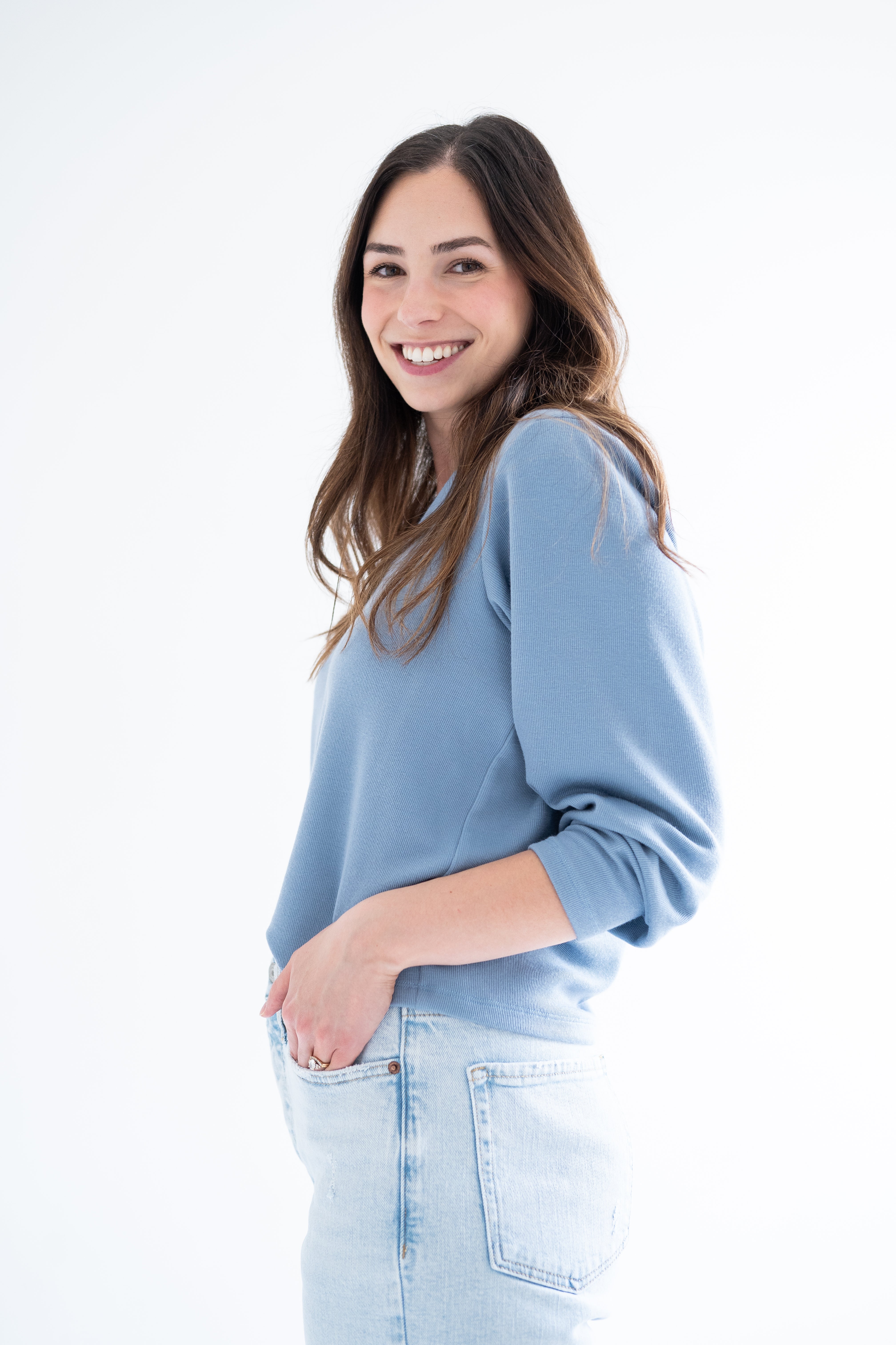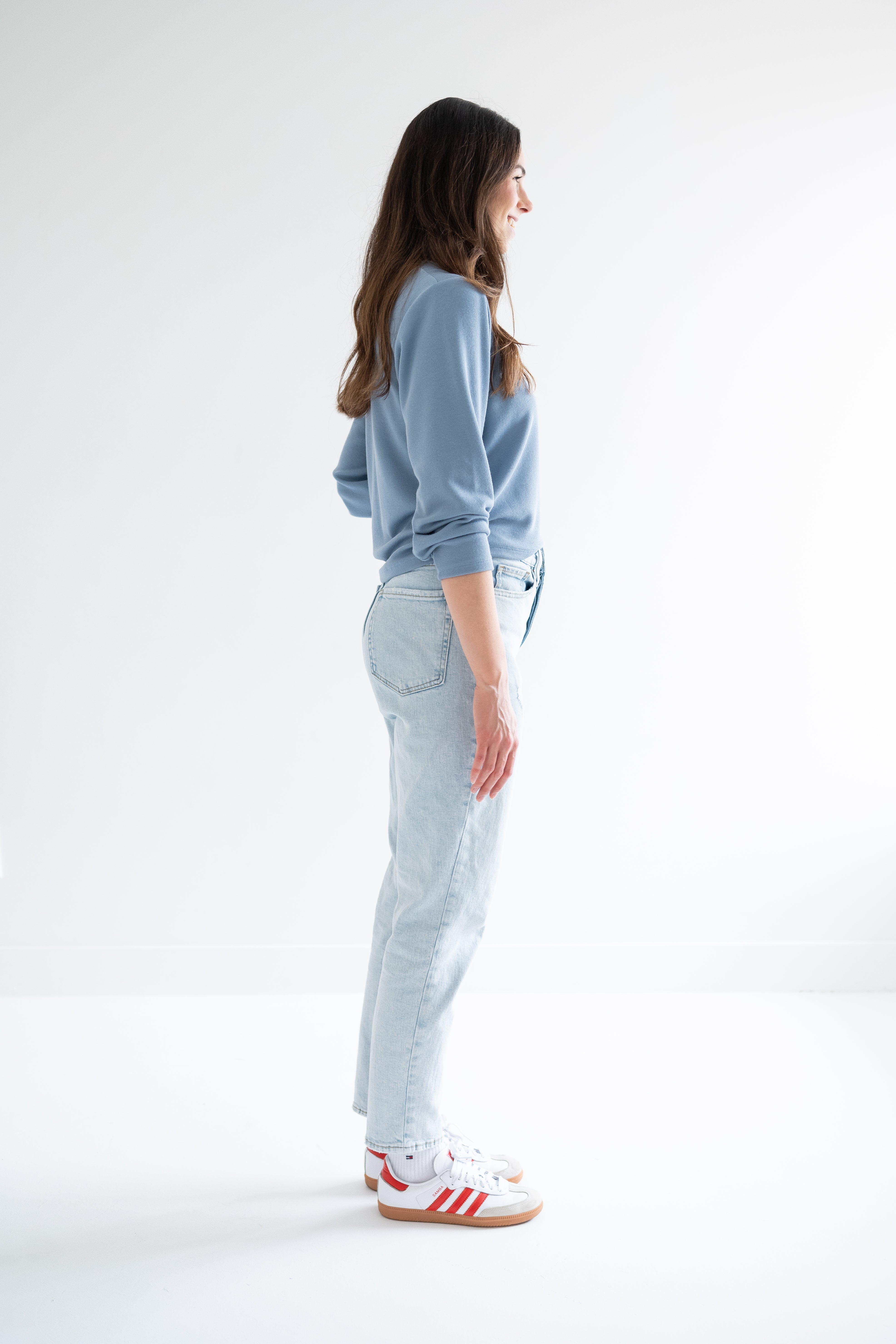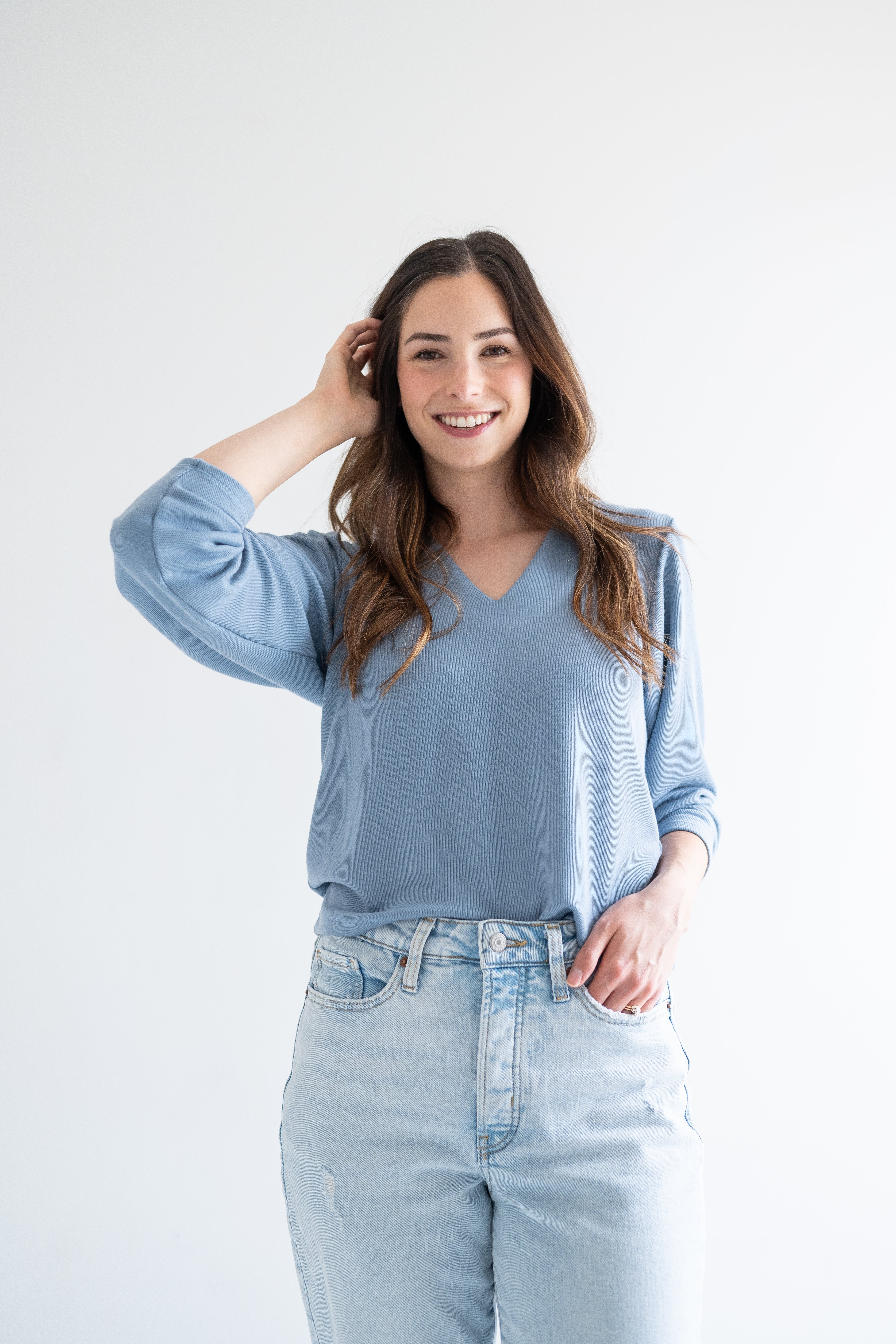 side view of woman wearing sky blue v-neck sweater