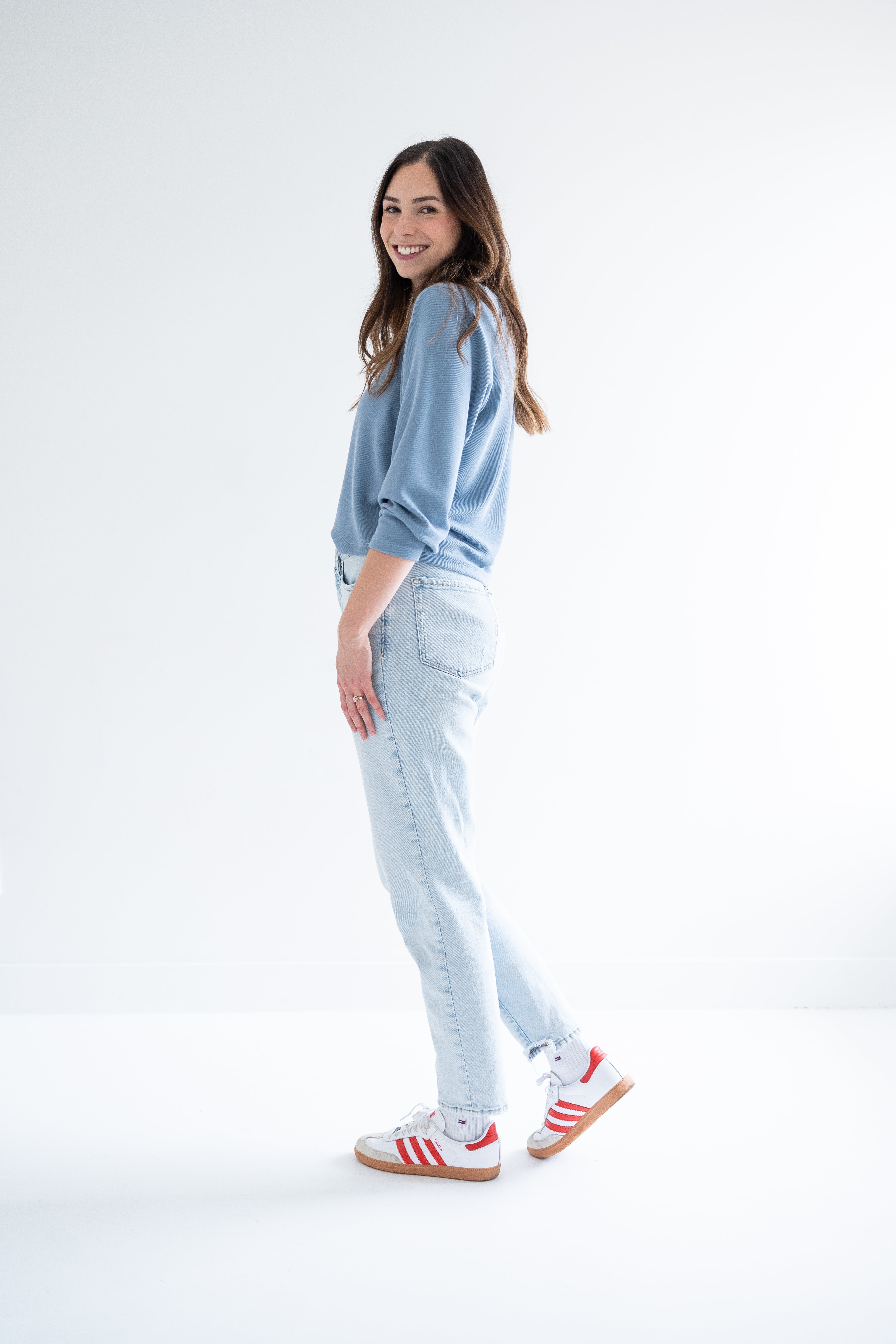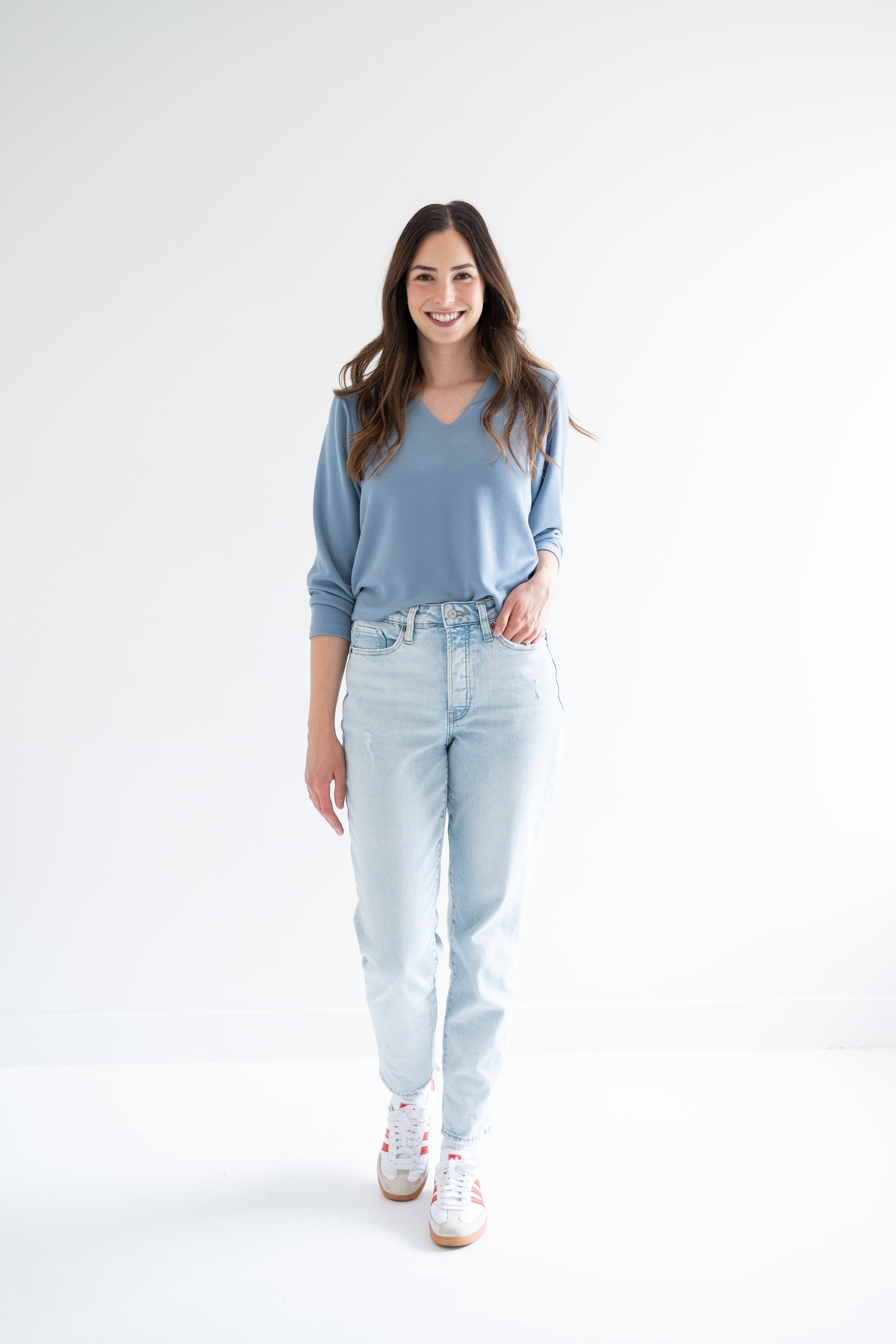 woman wearing blue v-neck sweater and jeans with addidas sneakers