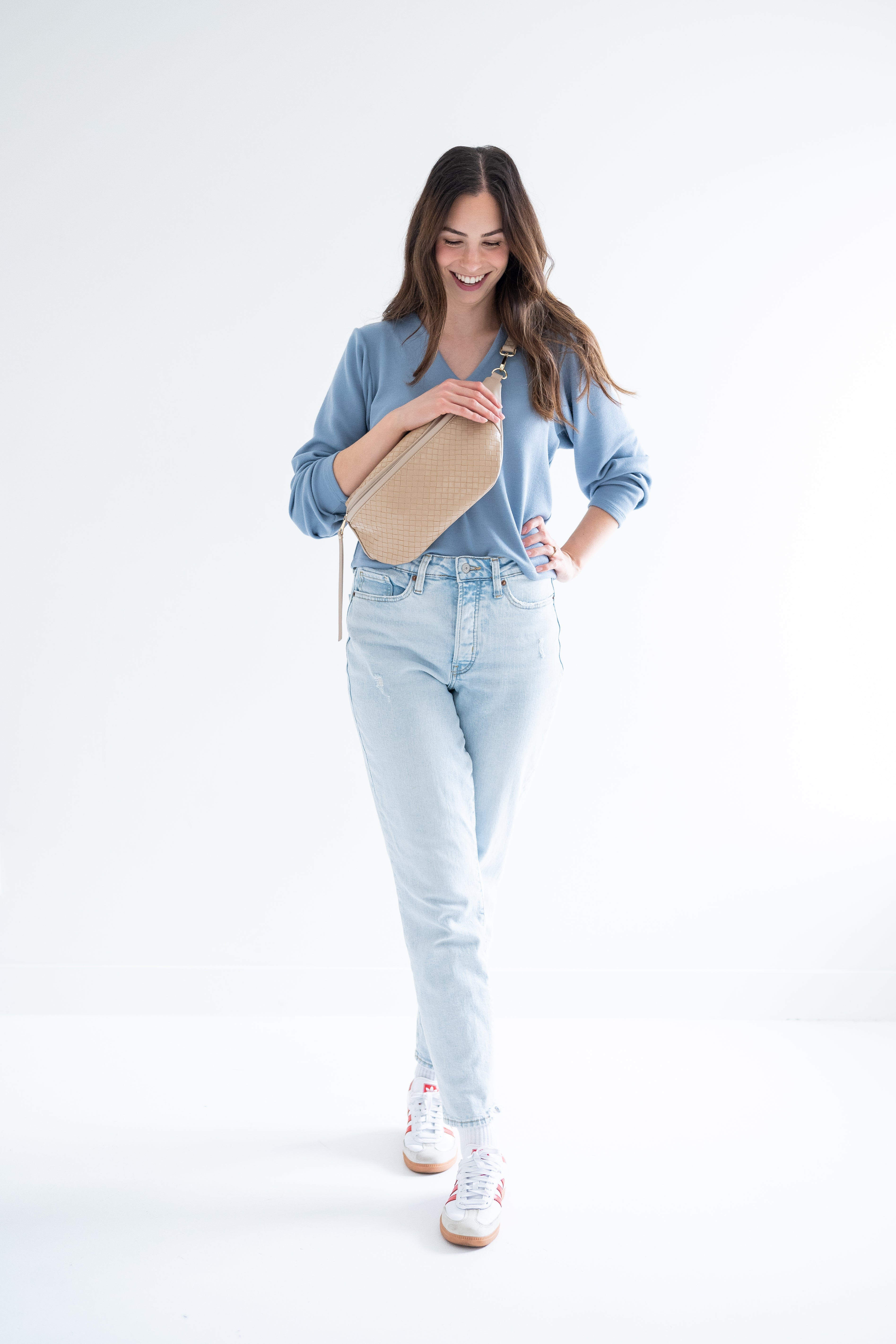 woman wearing blue v-neck sweater, fanny pack and light wash denim and sneakers