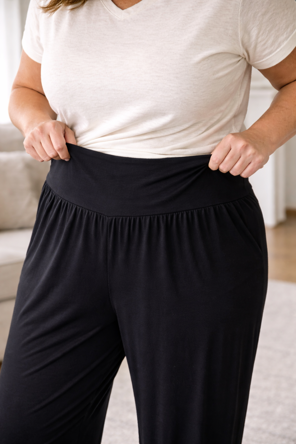 close up photo of woman wearing a white vneck tshirt and black wide leg pants. close up photo of waistband