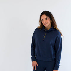 Side View. Ang Hill woman wearing navy blue bamboo loungewear set. Made in Canada