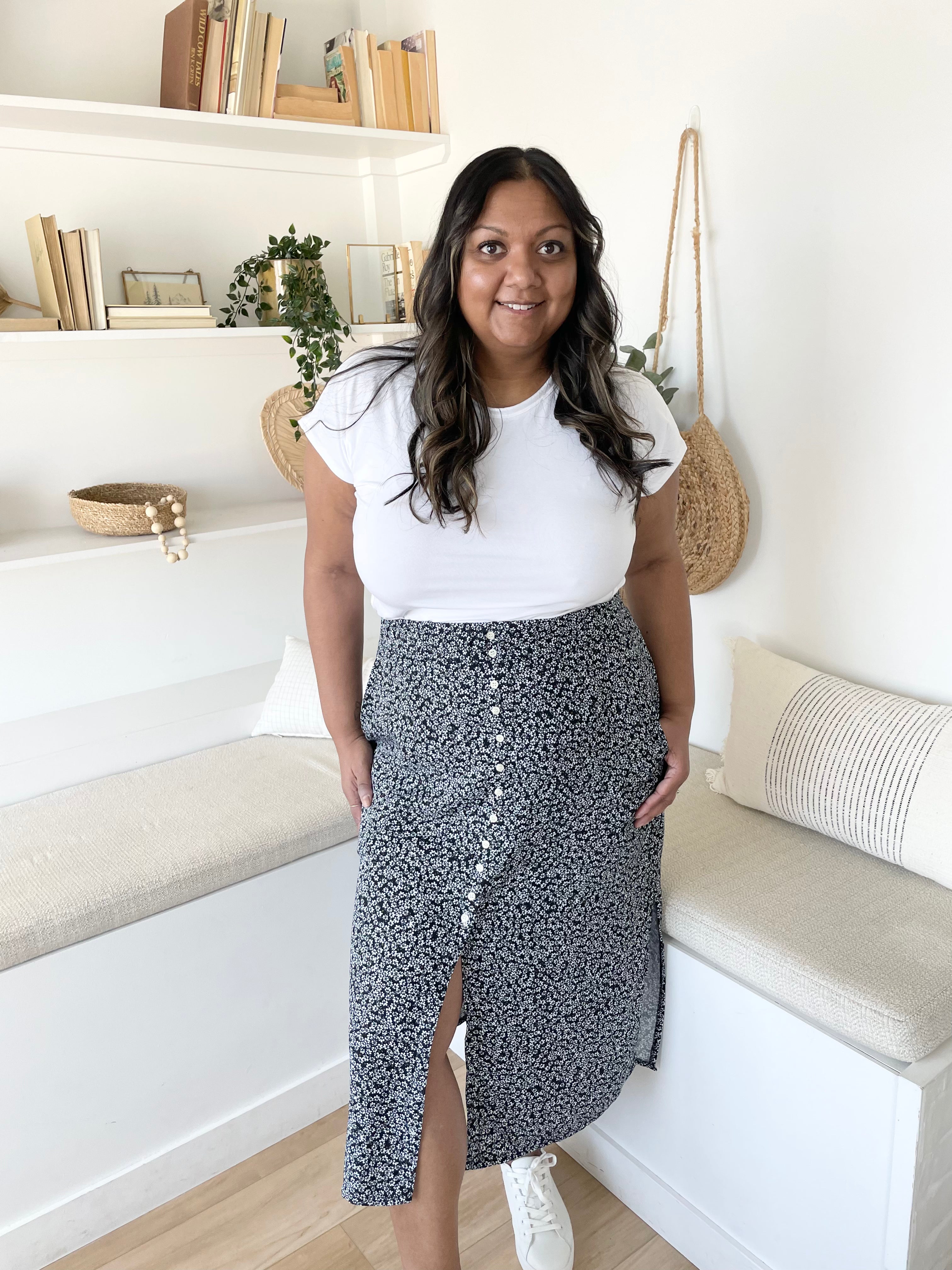Woman wearing a white t-shirt with text and graphics, black satin maxi skirt, and beige hat in a minimalistic setting. Made in Canada